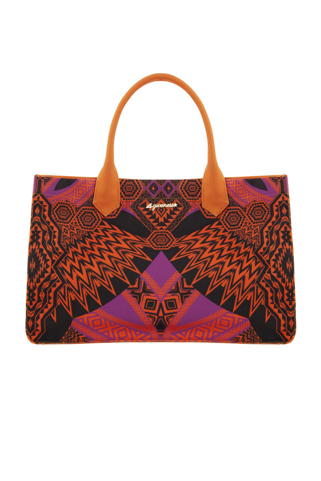 Canvas shoulder or hand bag in a pattern with a clip closure.