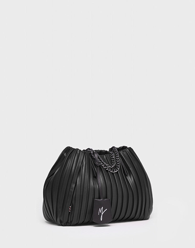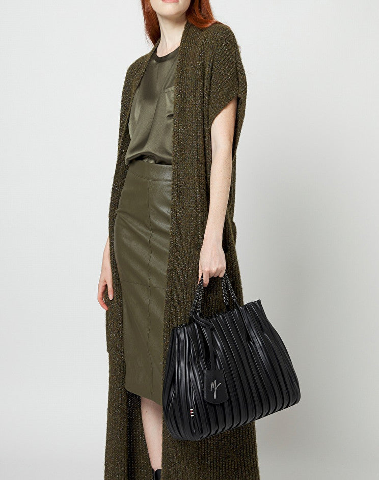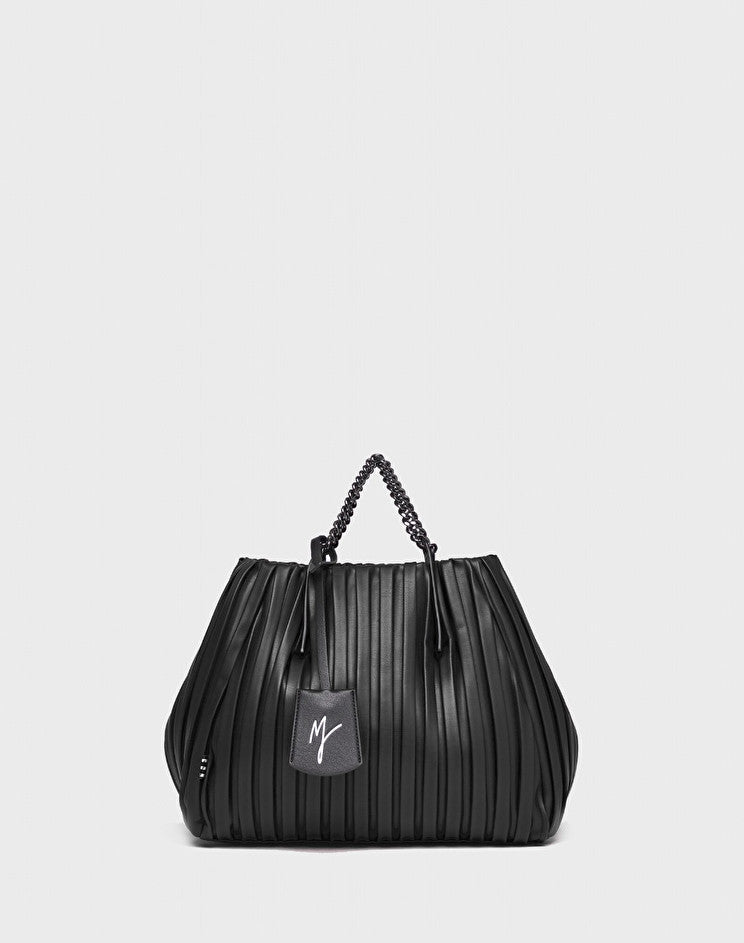 Enrich your bag collection with a charming Jasmine from Manila Grace. This model with a spacious silhouette is made of soft pleated synthetic leather. Equipped with chain handles, it can be carried by hand or on the shoulder, thanks to the removable and adjustable strap. An accessory that knows no seasons, for outfits that exude glamour. The bag is 34 cm wide, 28.5 cm high, and 16 cm deep.
