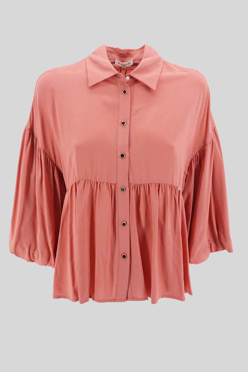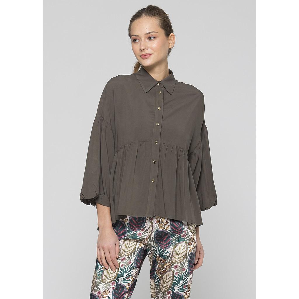 NUPURA is a shirt with a central button placket that has a trendy and contemporary look: the viscose fabric makes this garment soft, enhanced by the gathering at the bottom of the hem and the T-sleeve. Adorable!