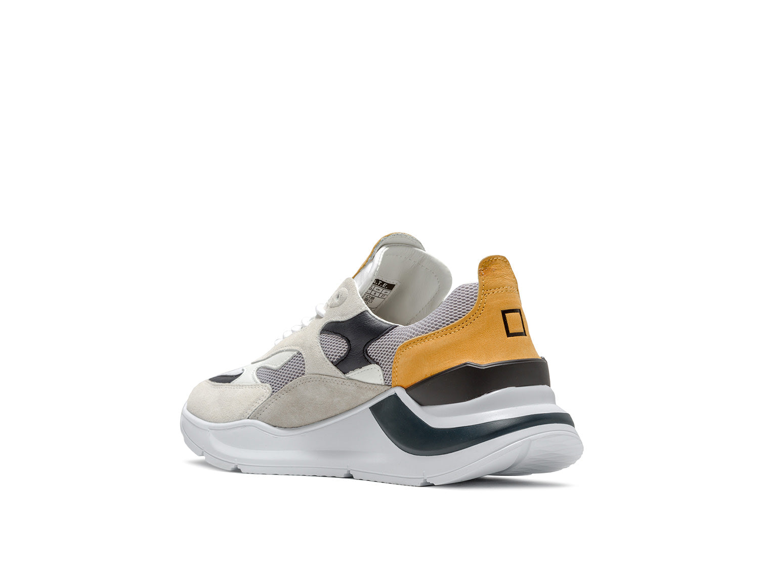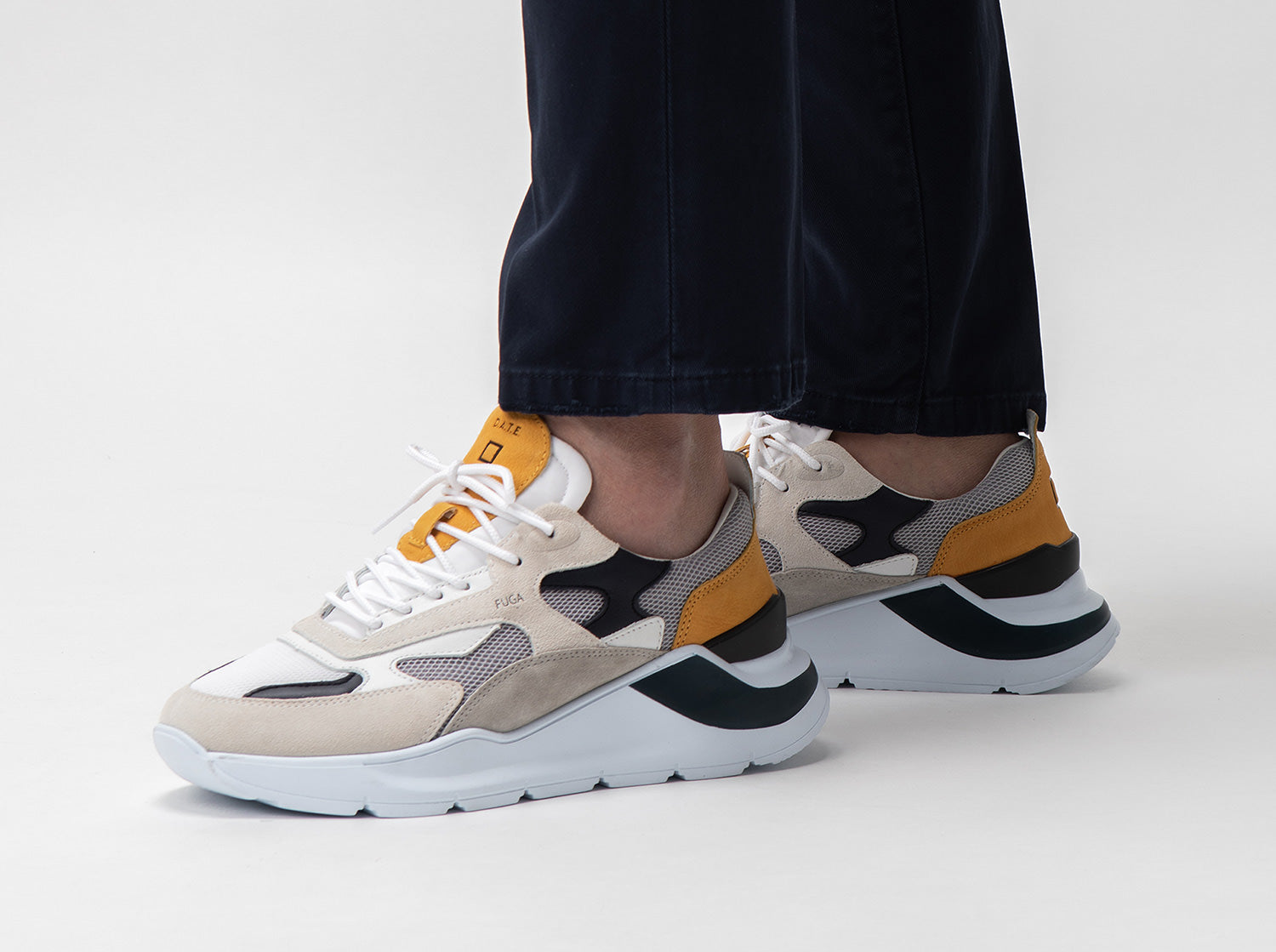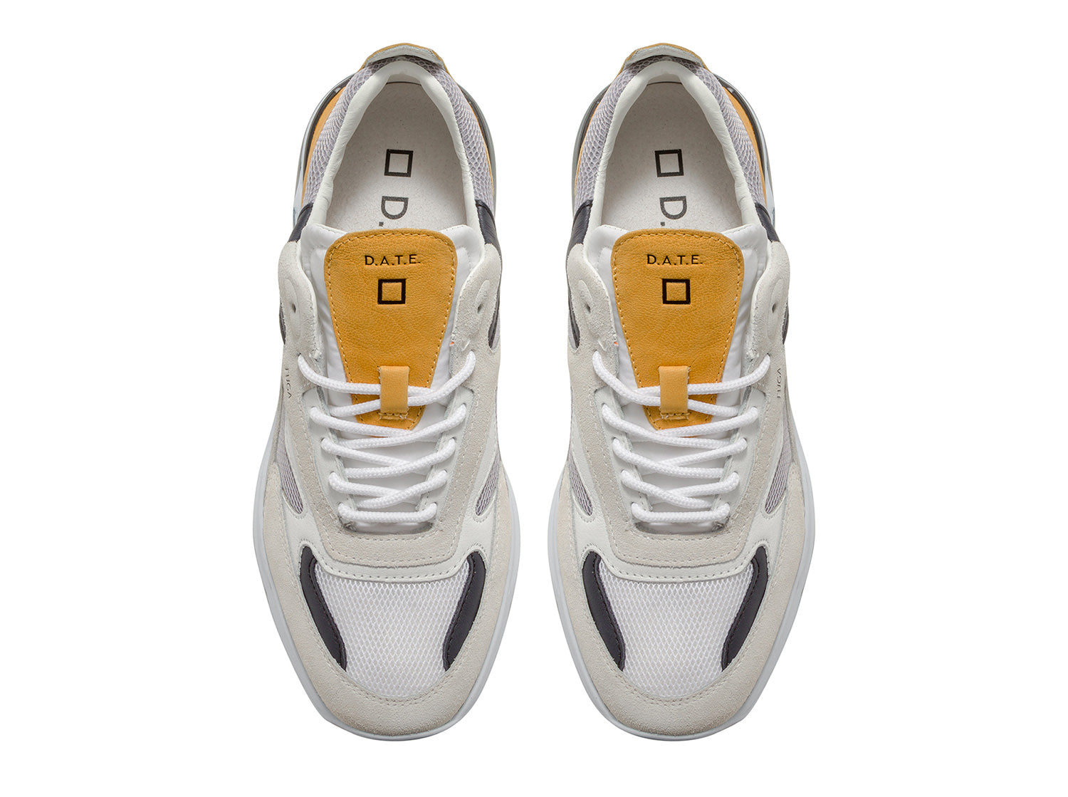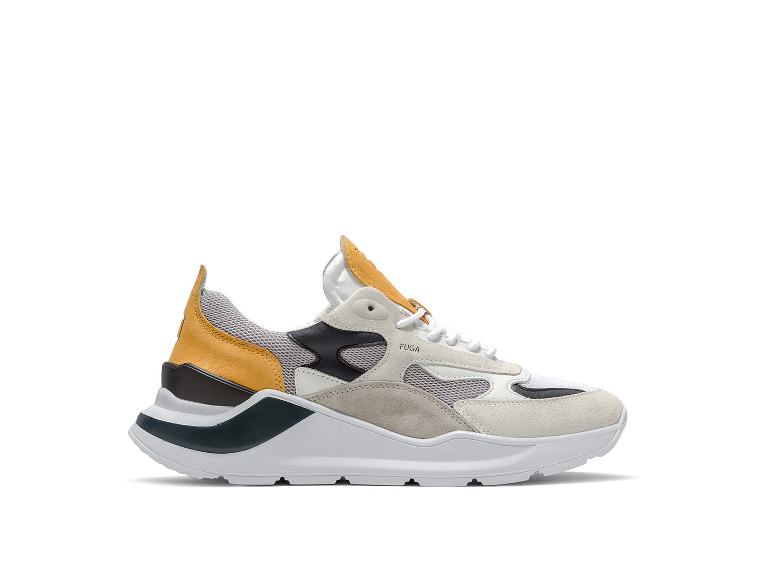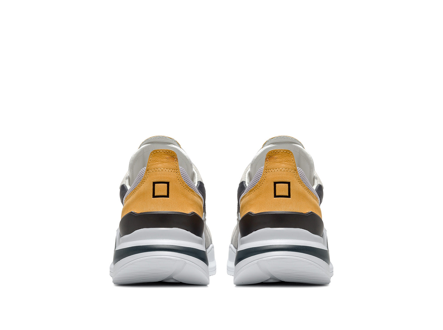 Running sneaker in gray mesh with beige suede inserts. Details in white and black leather. The patch in ochre yellow leather with the logo and the D.A.T.E. inscription is sewn on the tongue. The laces are round and the square logo is embossed on the back. The name FUGA is embossed on the side. Lining in leather and cotton sponge. The gel insole is raised by 2.5 cm for better comfort. The blowtech gum sole is 2 - 5 cm high. All selected fabrics and leathers are Made in Italy.