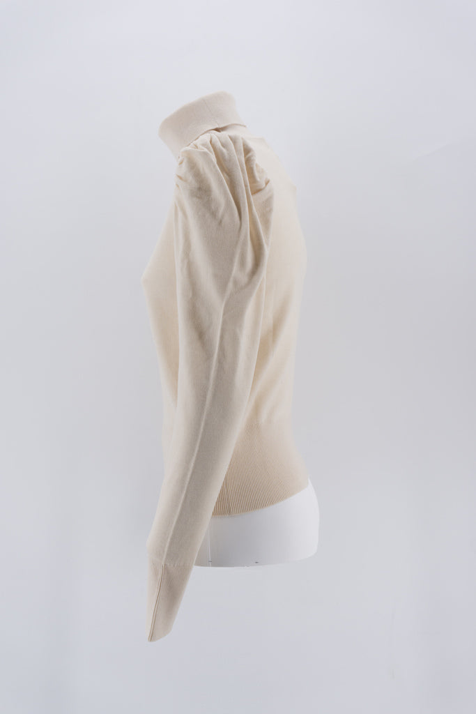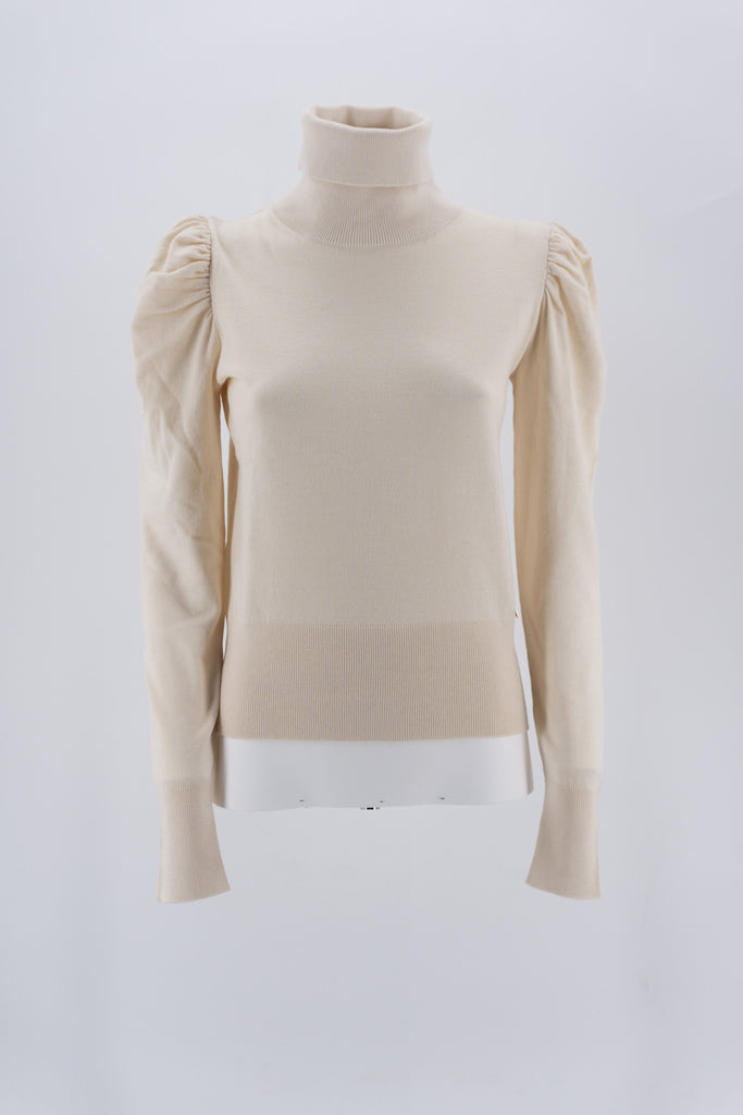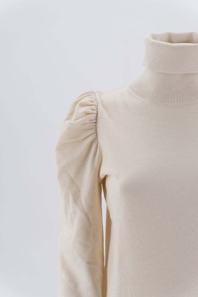 High neck top with puff sleeves Brand Code: DAWN FABRIC 1: 43% POLYAMIDE 42% VISCOSE 12% WOOL 3% ELASTANE
