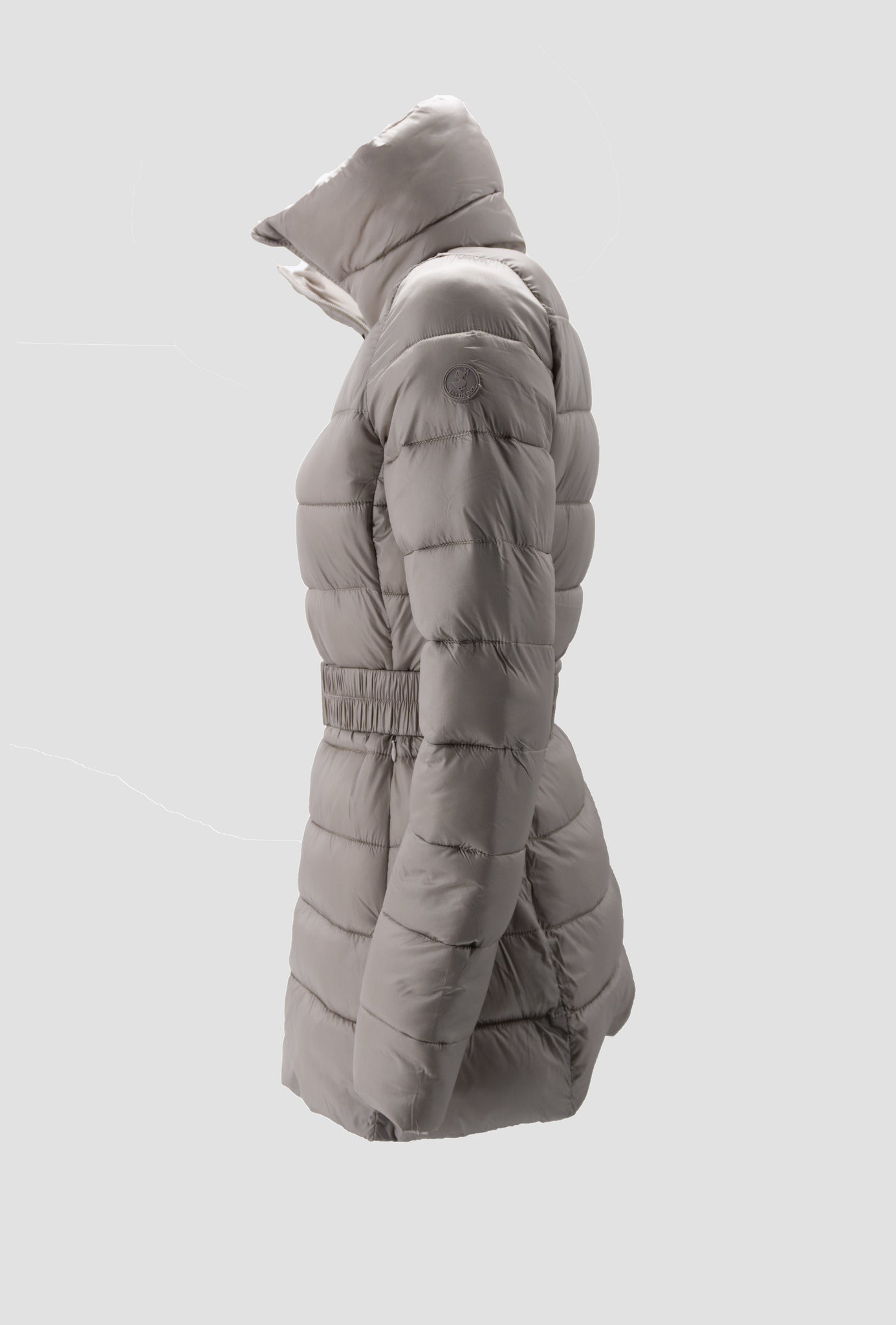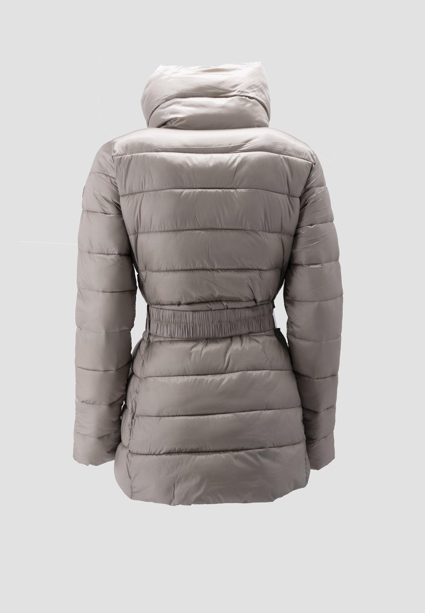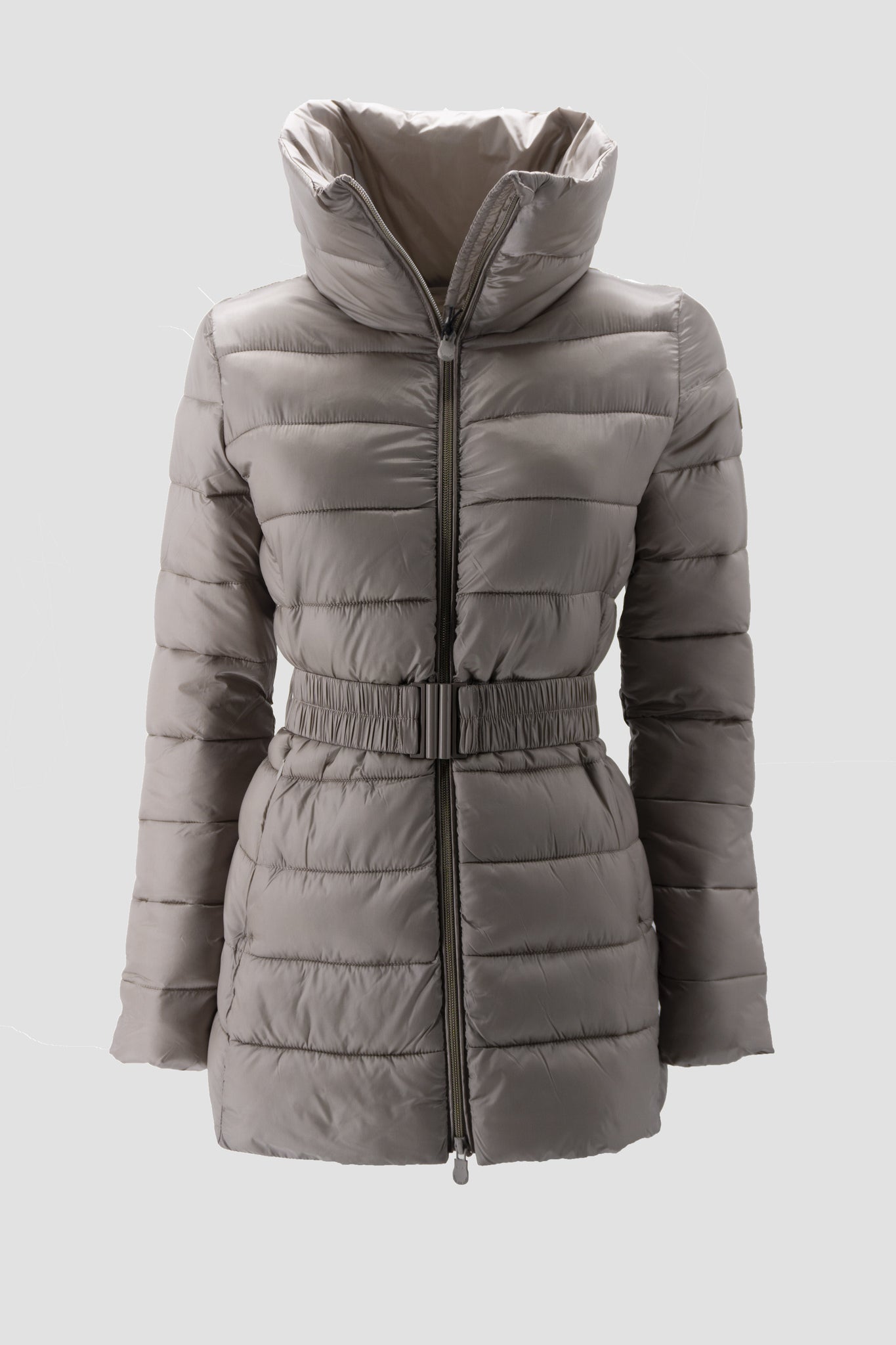 This elegant long quilted coat is ideal for protecting yourself from the cold and wind with style. It has a fashionable look, thanks to the material it is made of, the waist belt, the visible zip closure, and the stand-up collar.
