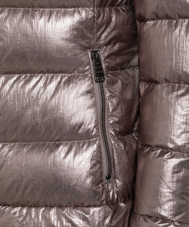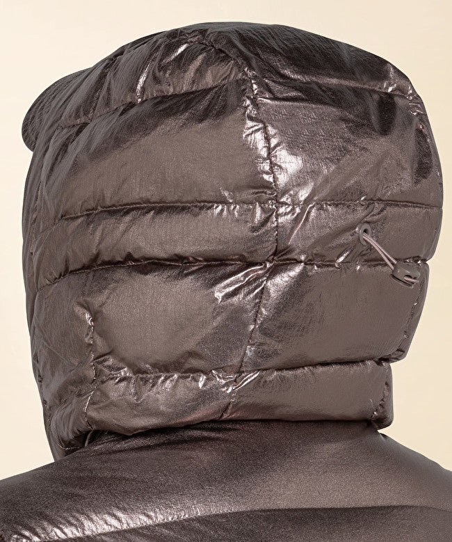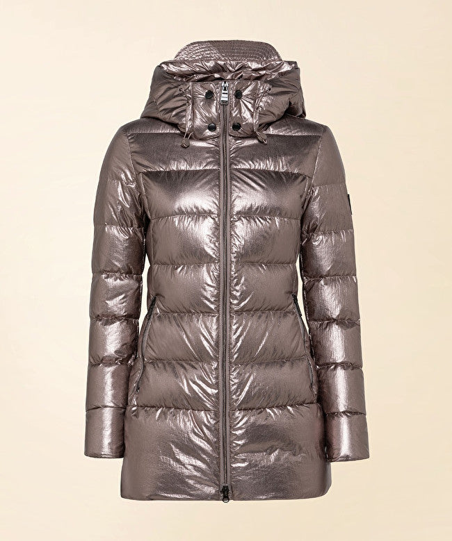 Long down jacket, with a slim fit, made of super lightweight, semi-shiny and soft nylon fabric. Central full zip, side pockets, and a stand-up collar with a hood, visor, and adjustable drawstrings. A classic and functional model suitable for all uses, on any occasion.